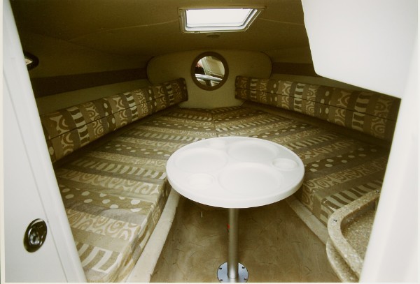 Kajütenansicht. Der Tisch ist herausnehmbar und kann zusätzlich im Cockpit verwendet werden.
