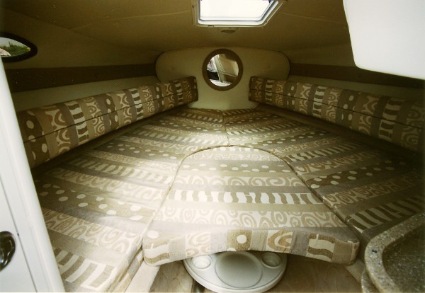 Im Hintergrund sieht man die "Liegewiese", rechts den Durchgang nach achtern, man muss also nicht über Polster klettern, um ins Boot zu gelangen. Rechts ist das Waschbecken, darunter der Abfalleimer. Die beiden vorderen Sitze sind drehbar. Durch das geöffnete Mittelfenster kommt man auf das Vorderschiff.